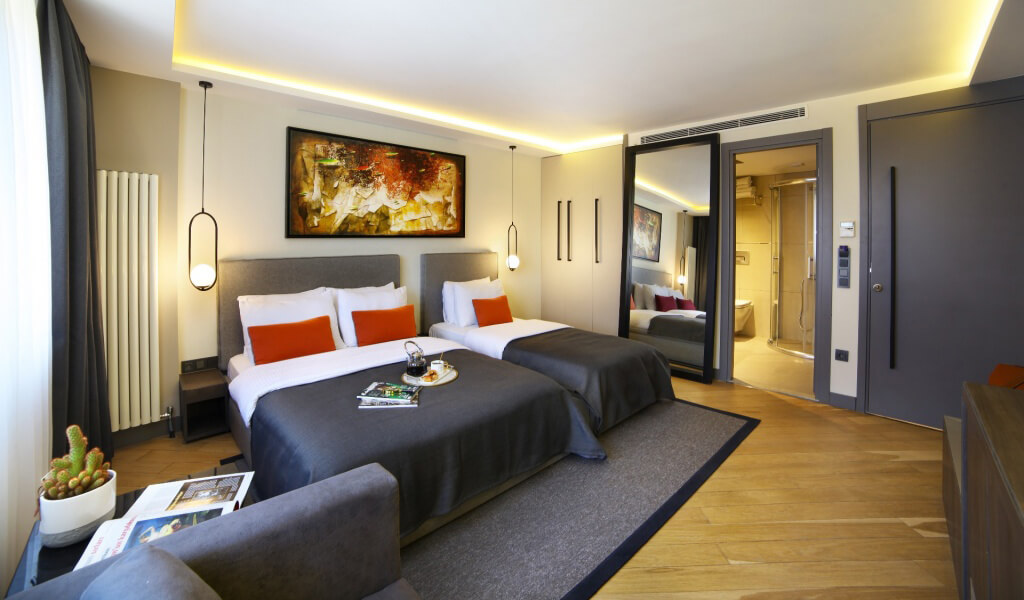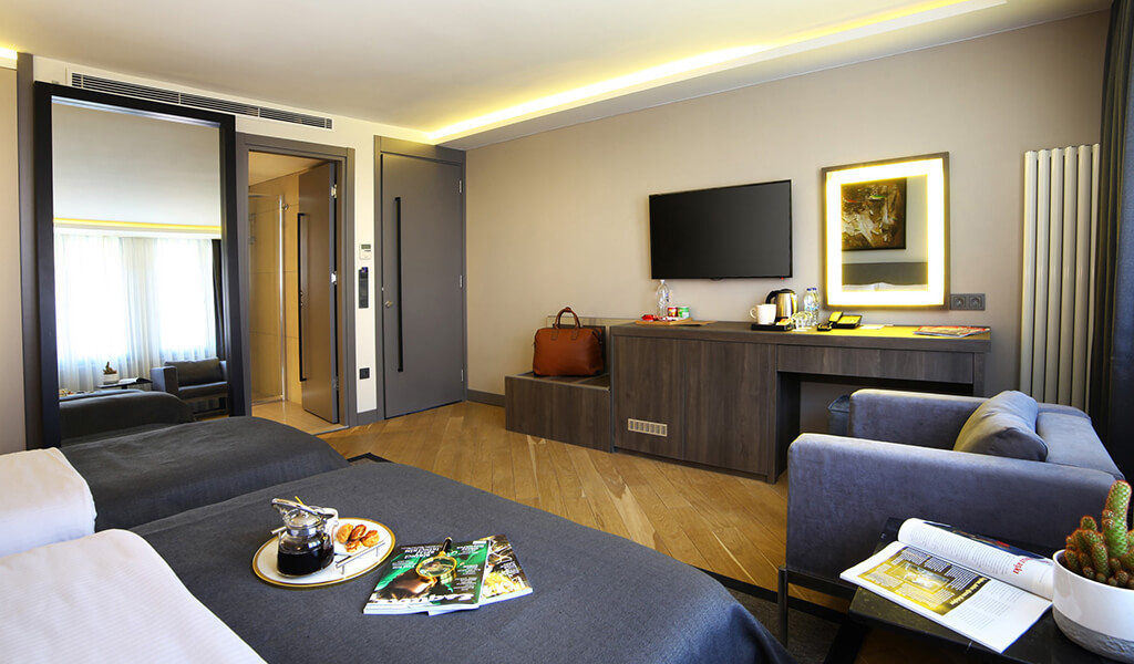 Aile Odası 32 m² olup, 1 adet 170x200 ve 1 adet 90x200 ortopedik yatak bulunmaktadır. Ek yatak ile 4 kişi rahatlıkla konaklayabilir. LED TV, minibar, ücretsiz çay-kahve ikramı, telefon, elektronik kasa, su ısıtıcısı, merkezi ısıtma, ergonomik sandalye, klima, tuvalet masası, LED aynalı makyaj masası, lüks banyo malzemeleri ve saç kurutma makinesi mevcuttur. Ortopedik yataklarımız, yatıştırıcı renkleri, zarif kişisel bakım ürünleri ve lezzetli kahvaltımız ile misafirlerimizin güne dinç ve enerjik başlamasını sağlar. Konforlu bir konaklama ve kaliteli bir uyku için gereken her şey odalarımızda bulunmaktadır.