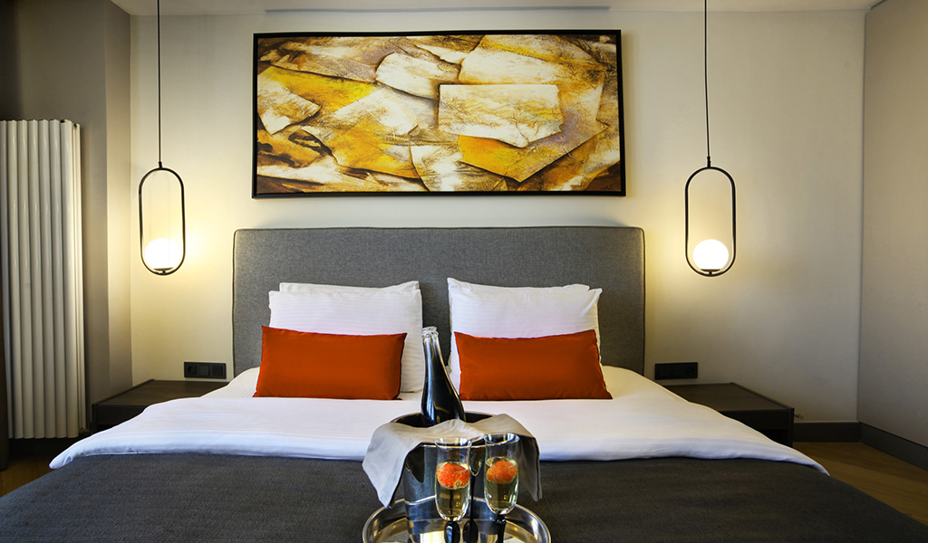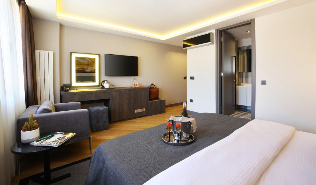 Deluxe Room is 29m2 and it has 1 190 * 200 orthopedic bed. With an extra bed, 3 people can easily stay. There are LED TV, minibar, free tea - coffee, telephone, kettle, central heating, electronic safe, ergonomic chair, air conditioning, vanity table, LED mirror, luxury toiletries, hair dryer. Our orthopedic beds, soothing colors, elegant personal use products and a delicious breakfast will help our guests start the day fresh and full of energy. Everything necessary for a comfortable stay and a great sleep is available in our rooms for our guests.
