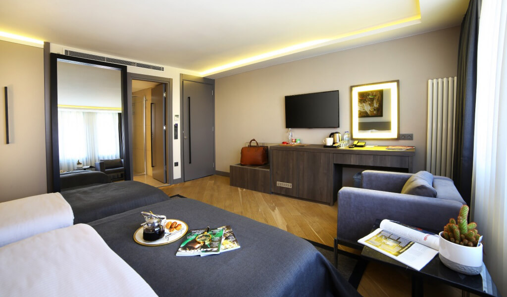 The Family Room is 32m2 with 1 170 * 200, 1 90 * 200 orthopedic bed. With an extra bed, 4 people can easily stay. There are LED TV, minibar, free tea - coffee, telephone, electronic safe, water heater, central heater, ergonomic chair, air conditioning, vanity table, LED mirror, luxury toiletries, hair dryer. Our orthopedic beds, soothing colors, elegant personal use products and a delicious breakfast will help our guests start the day fresh and full of energy. Everything necessary for a comfortable stay and a great sleep is available in our rooms for our guests.